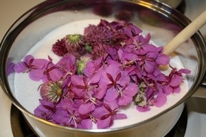 Варить, постоянно помешивая до момента обесцвечивания кипрея, пока вода не станет фиолетового цвета.